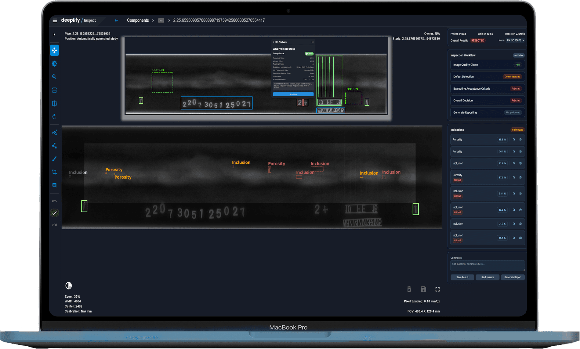 deeplify inspect helps asset owners and NDT service providers digitize and automate inspections—from planning and data integration (e.g., radiographic testing, ultrasonic testing) to evaluation, automated reporting, decision support, and audit-ready data management.